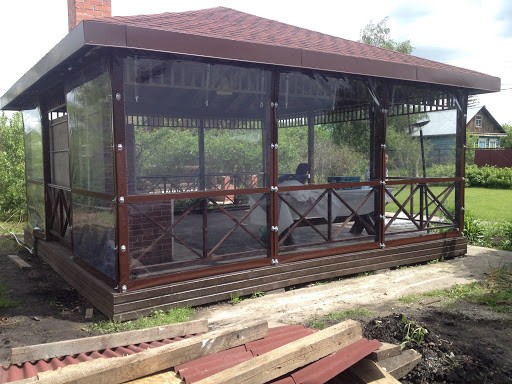 На вид мне окна понравились сразу: прозрачные, даже не видно. И рамы можно подобрать любых цветов. Кажется, что стекол нет вовсе, но при этом все закрыто плотно. Думаю, несколько лет они точно простоят. И для веранды этот вариант мне нравится гораздо больше, чем карбонат: и открыть можно, и свет пропускает, а вечером можно любоваться звездами: видно все отлично.
