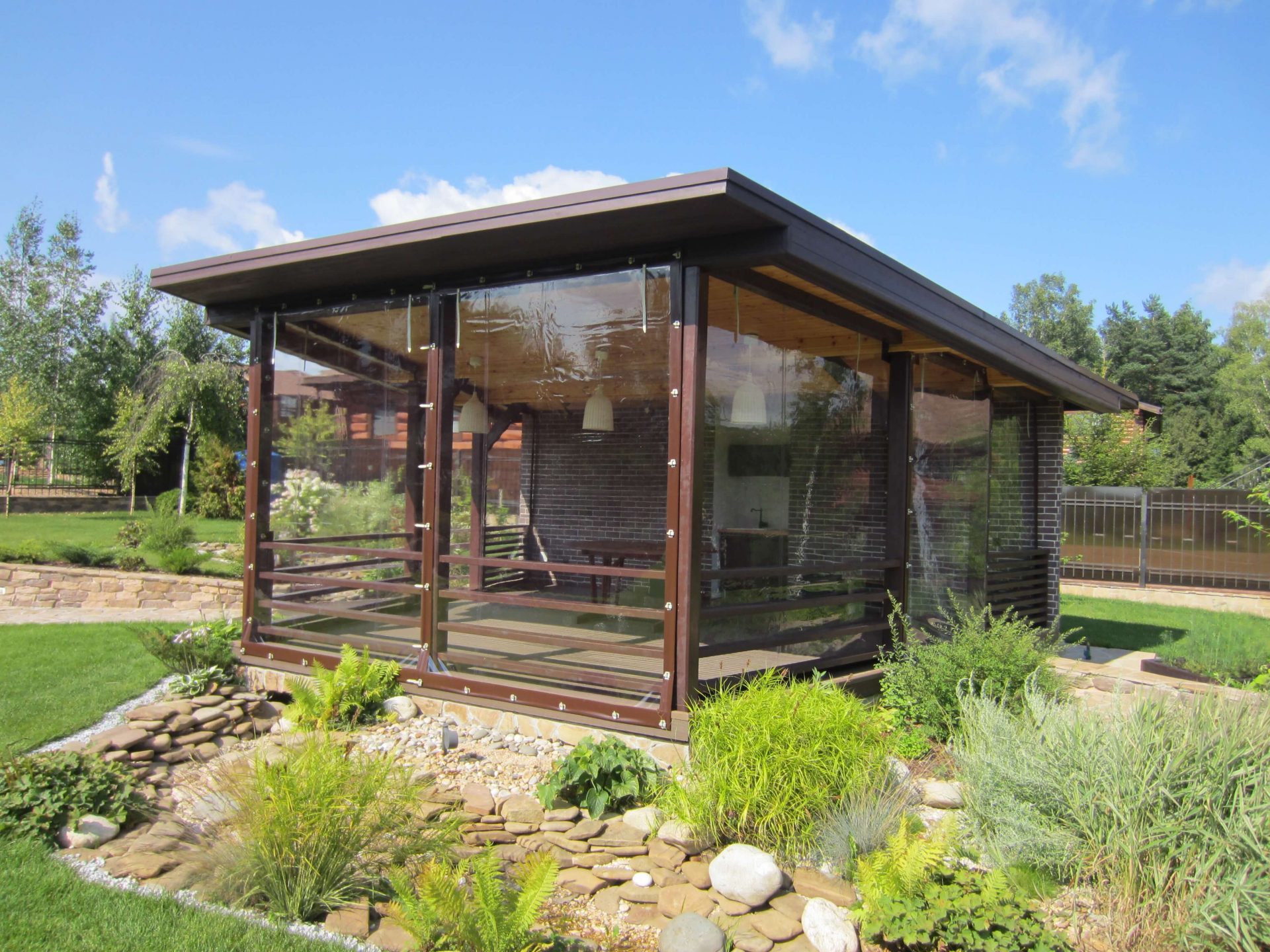 Жидкие окна стоят заметно дешевле традиционных стеклянных или пластиковых. Они также оснащаются москитными сетками на молнии для защиты от насекомых. Мягкое остекление защищает не только от непогоды, насекомых, оно поддерживает стабильную температуру воздуха внутри и может использоваться с нагревательными приборами.